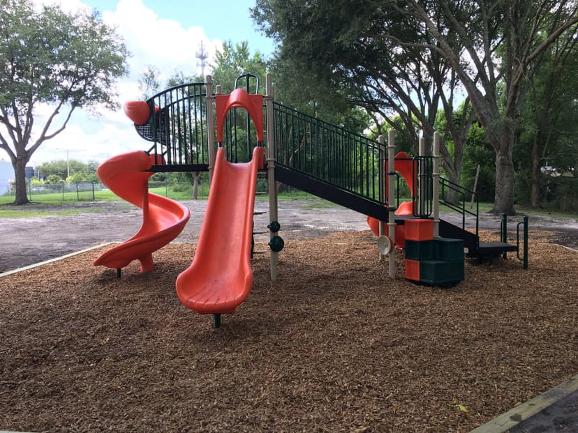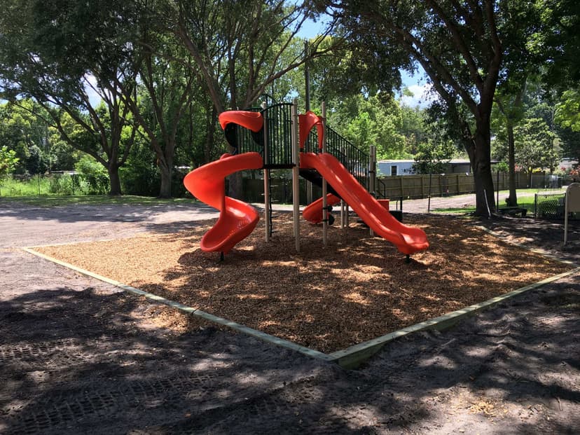 This little park keeps it simple with a basketball court, a playground, and an open play field.
