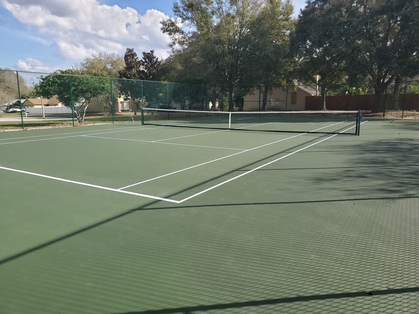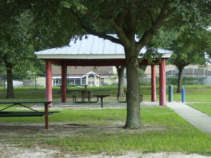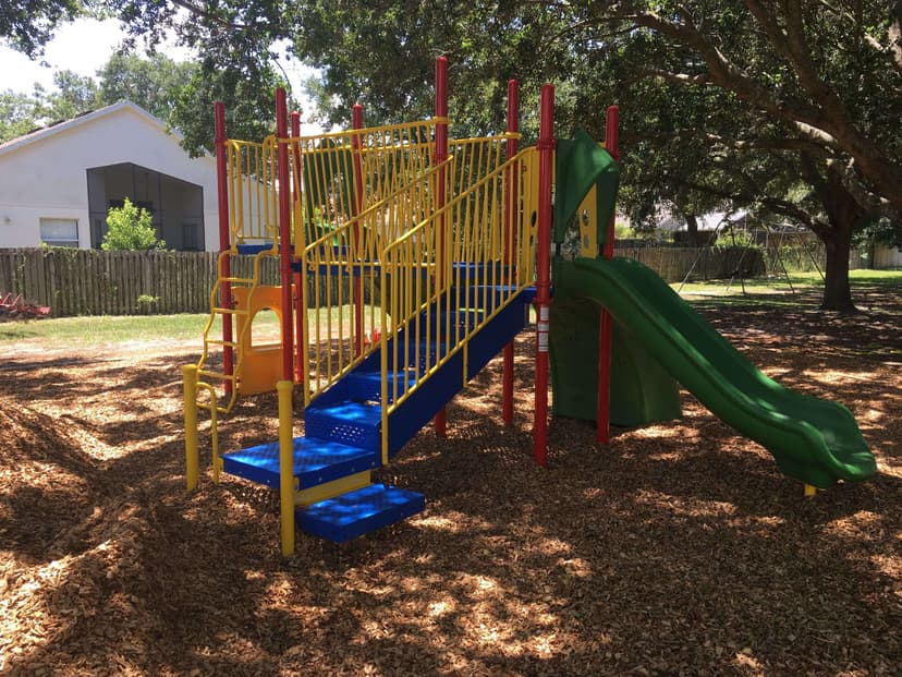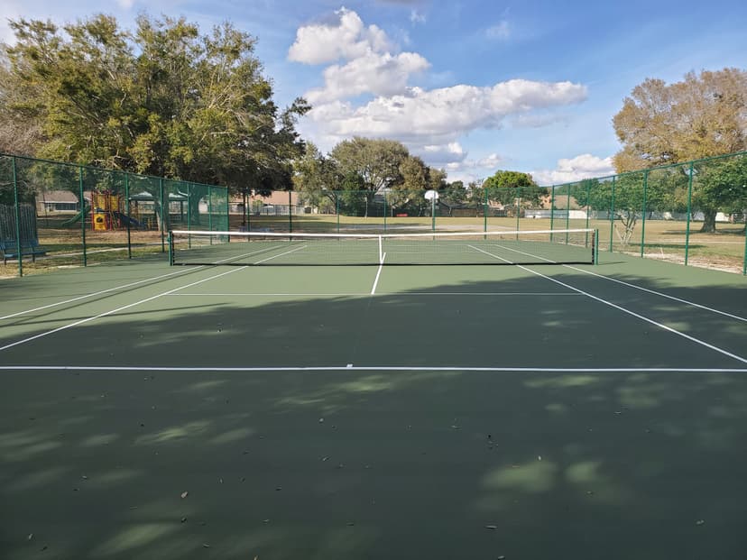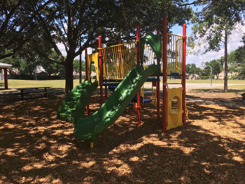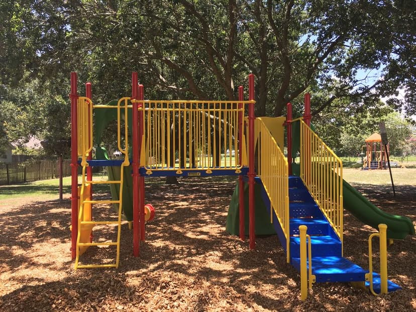 A wonderful park with a playground that has natural shade from the oak trees spread out around the park, and courts to play on.