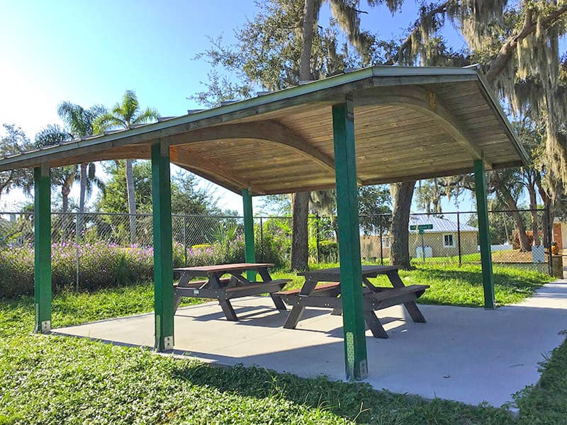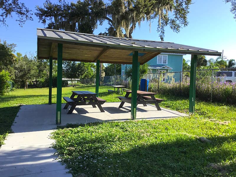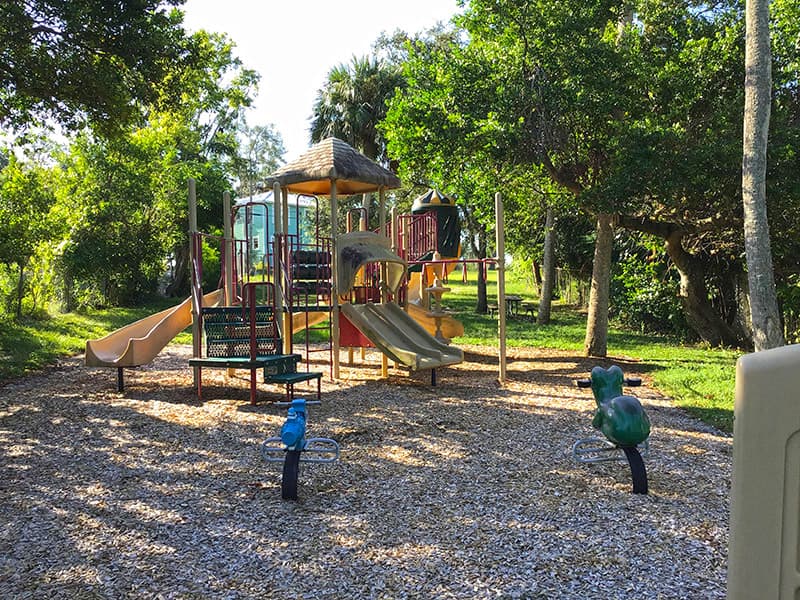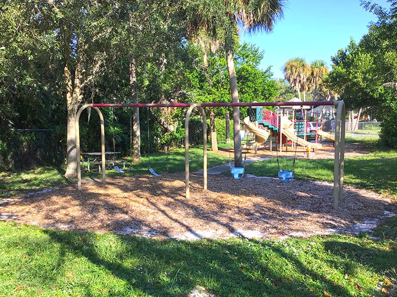 This shaded half-acre mini fenced park includes a playground with toddler equipment and shaded picnic area.