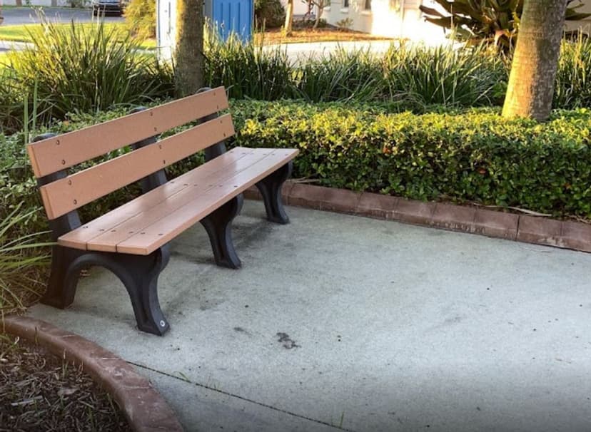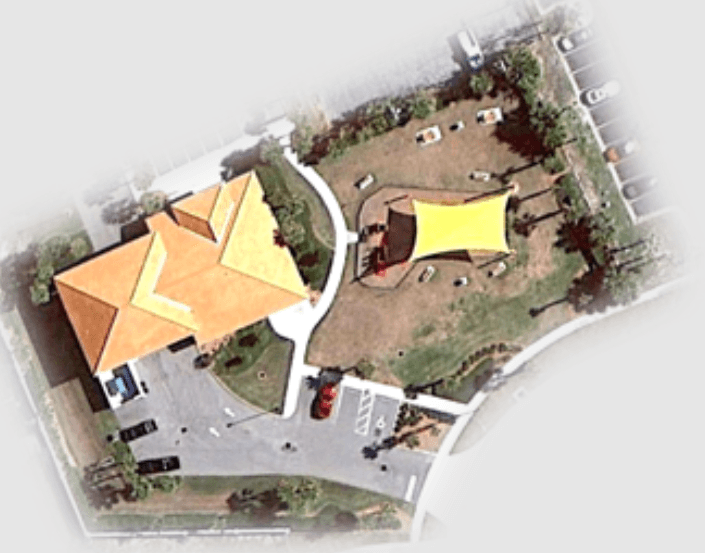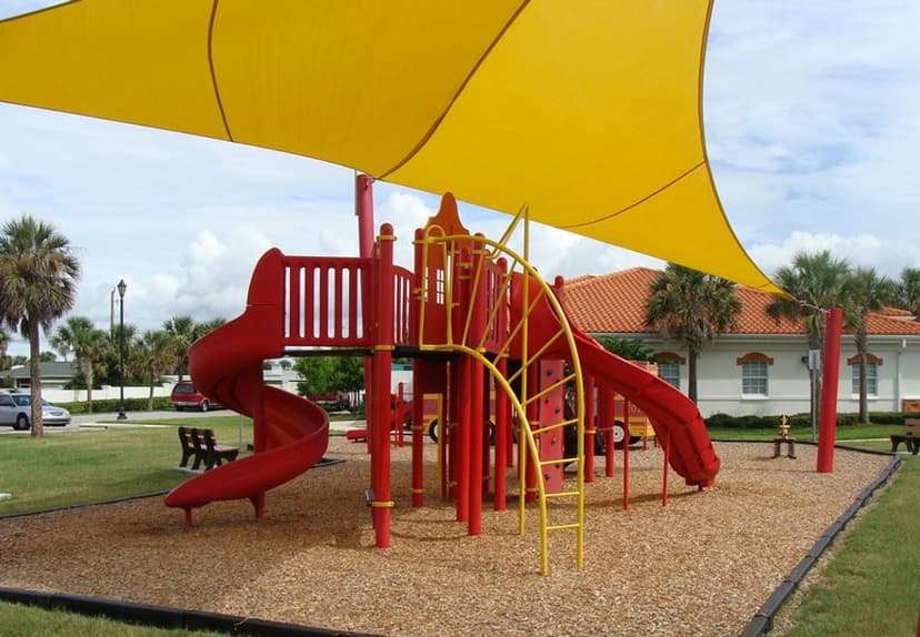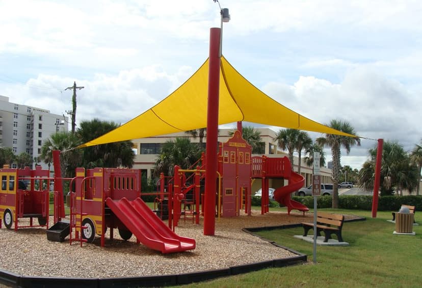 The nearby Fire Station #91 has an effect on this little community park. The playground equipment is painted bright red and includes a tiny fire engine and firehouse. Benches and picnic spots are also provided at the park. The sun cover is supported by poles in the play area.