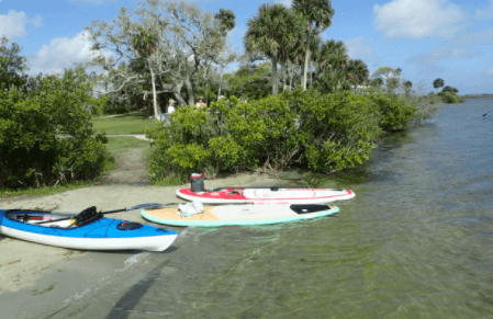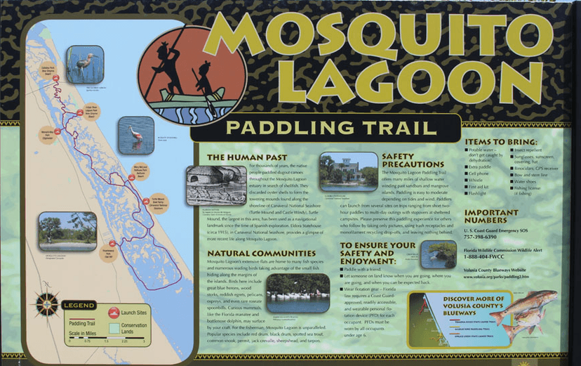 The official paddling routes at Mosquito Lagoon go from Callalisa Park in New Smyrna Beach to Turtle Mound in the Canaveral National Seashore, which is five miles away. The total distance is more than 15 miles one way; however, the course includes several interior loops.