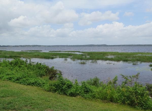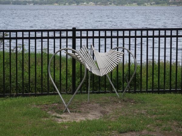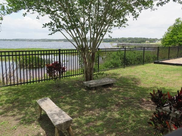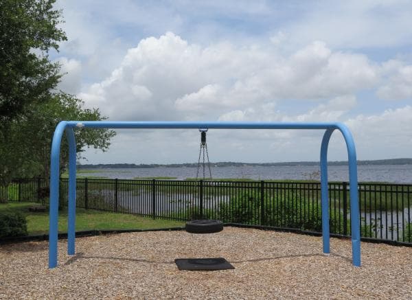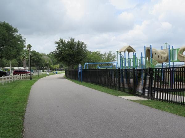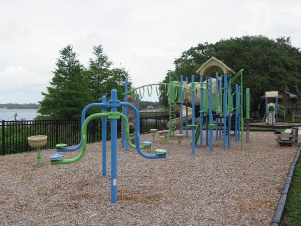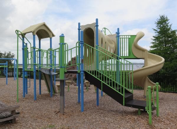 Between the bike path (S. Lake Trail) and Lake Minneola, there is a small strip of land known as West Beach Park. The playground is small, but it's a lot of fun. It's fenced in, with small wooden benches arranged in a square beneath some trees. A small fishing pier can be found around the corner, hidden behind a building.