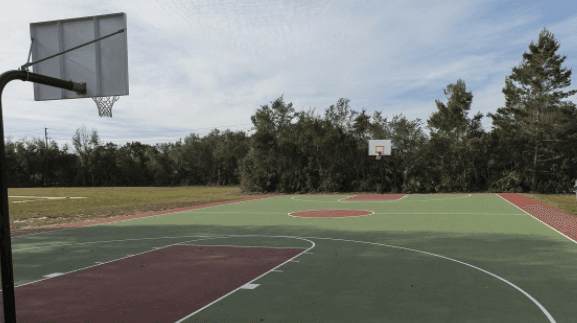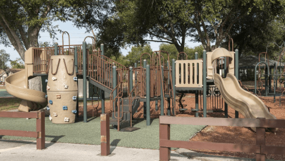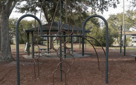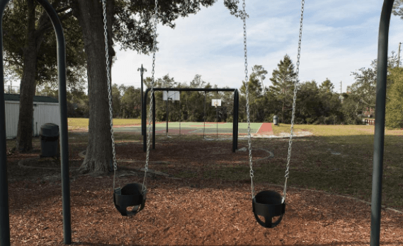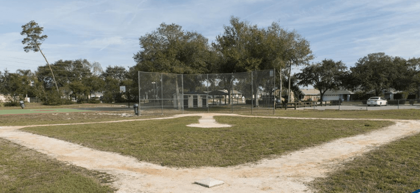 Timber Ridge Park has a tiny T-ball field, a picnic area, bathrooms, a basketball court, a pavilion, a playground, and a quarter-mile walking route to enjoy.
