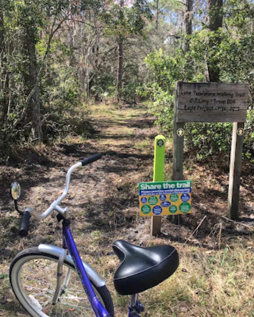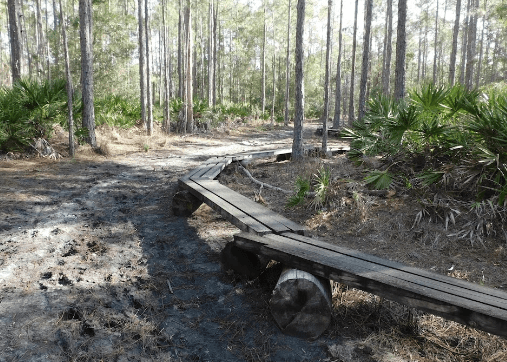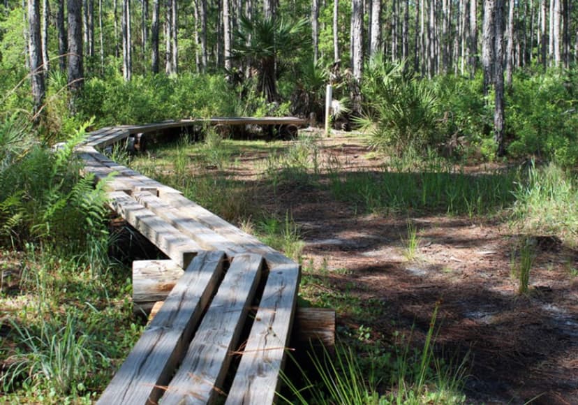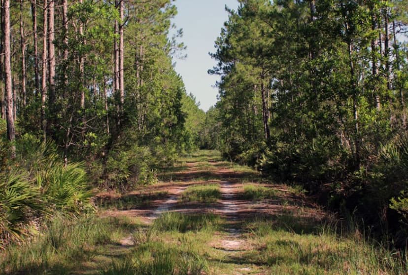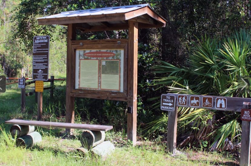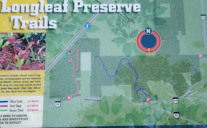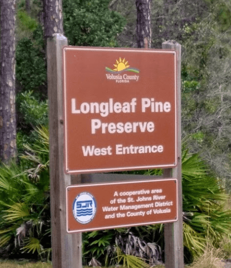 Longleaf Pine Preserve includes several natural communities, including mesic and wet flatwoods, cypress strands, cypress domes and scrub. The preserve, which covers 12,005 acres, has two long marked trails: The red trail is a 7 mile loop that begins and ends at the west entrance of the preserve. Along this trail, visitors may see mesic flatwoods, which are characterized by longleaf pine and slash pine and an understory dominated by saw palmetto and wiregrass. Cypress domes may be recognized along the red trail and throughout the site by the dome-like appearance of their pond cypress tree line. Cypress strands - elongated areas of cypress tree communities - also can be seen in the distance. The blue trail begins at the east entrance and crosses 6 miles of the preserve. It no longer connects to the red trail, so hikers and equestrians must turn around at the terminus. Signs are posted. The east end of the blue trail traverses through wet flatwoods with an overstory of slash pine and an understory of saw palmetto, gallberry and seasonal wildflowers. The central portion of the blue trail winds through cypress strand swamp. The blue and red marked trails are open to hiking, biking and horseback riding. Portions of the trail are subject to flooding - some areas possibly more than two feet. Although use of the trail when flooded may not be for everyone, traversing this natural site under wet conditions provides an opportunity to observe and experience the character of Florida's vital wet habitats. Wildlife along the trails may include sandhill crane, great blue heron, river otter, bobcat, coyote, fox, deer, black bear and alligator. The trails are long with little shade. Visitors should bring water to drink.