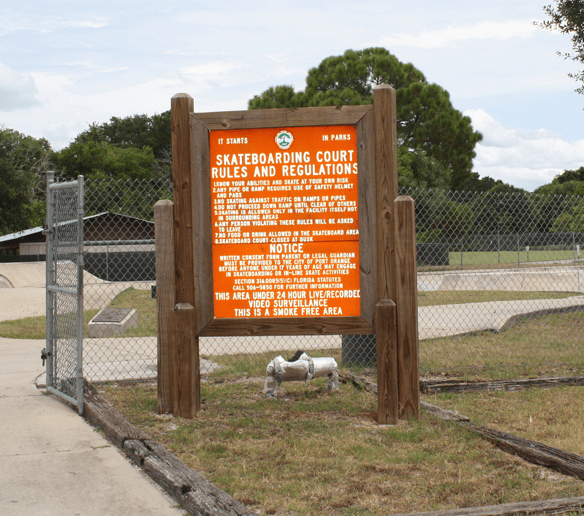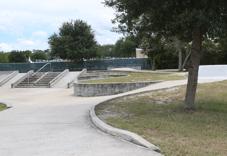 A two-acre concrete skate park for skateboards, rollerblades, and BMX bikes is one of the recreational amenities of the Port Orange City Center. Picnic tables with shade are also available at the location.