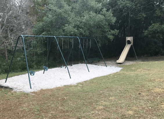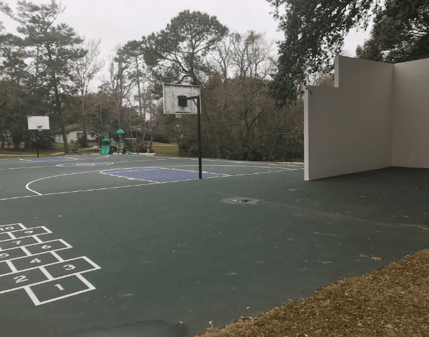 This spot has a basketball court and a playground with trash cans are conveniently placed across the area.