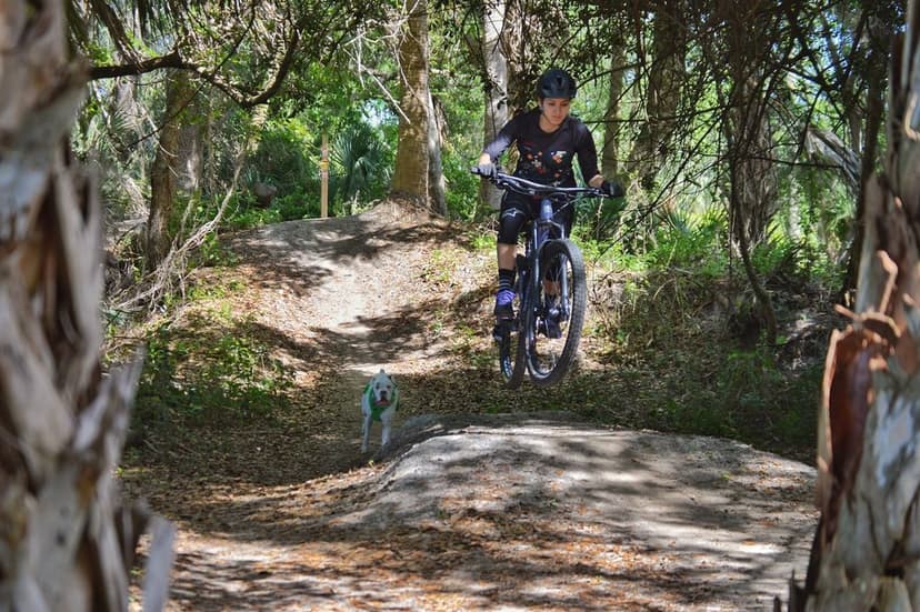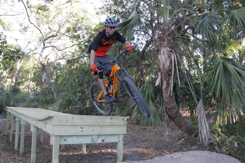 A freeride park built from a network of lines all of which contain multiple ride options. A 2.5 mile main loop circles the perimeter of the park providing access to multiple freeride line hubs as well as access to an intermediate to advanced flowy singletrack with uniquely Florida quick changing elevation. Every advanced feature on the main loop has a cross-country style bypass allowing users to progress at their own pace. In the center of the main loop is a dirt jump section that features multiple lines with multiple options specifically built for BMX, and DJ bikes. When on the main loop the rider is presented line options through the various hubs throughout the trail. These lines can be run in sessions and contain fast-flowing drops, tabletops, gap jumps, step-ups, step-downs, berms, etc. Trails are well marked, helmets are required, and caution is recommended.